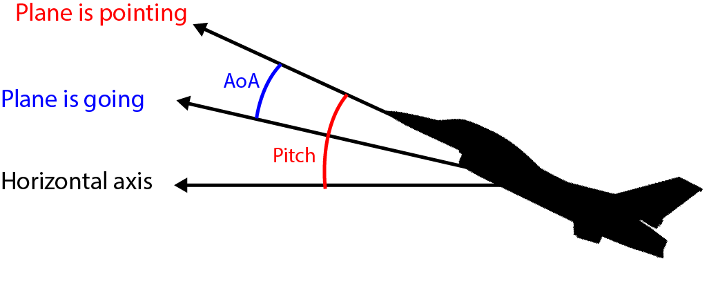 For example, if an aircraft is flying at 20 degrees pitch, but is actually moving at an angle of 10°, this would result in a pitch of 20°, but an AoA of 10°.